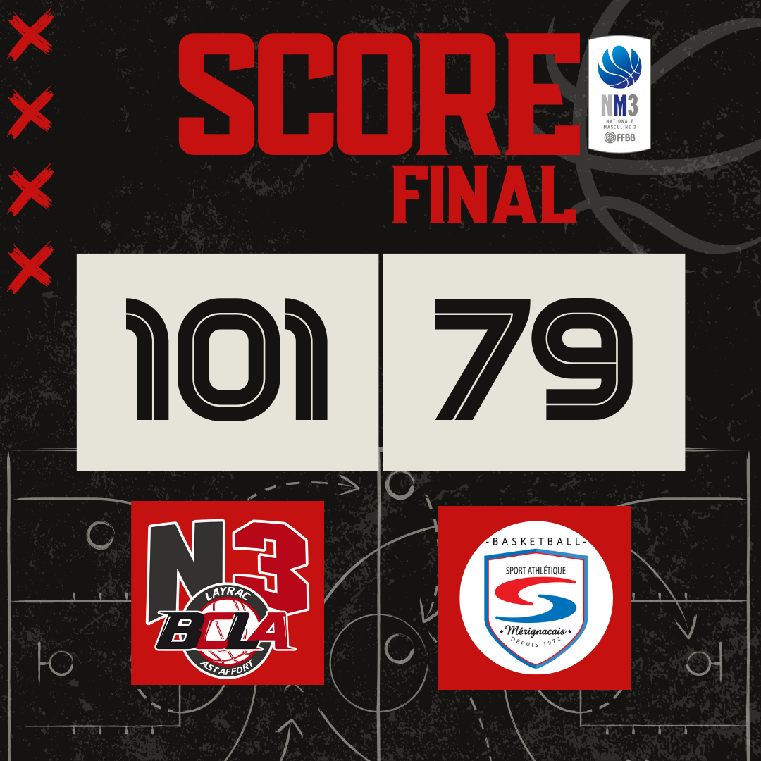 Les locaux sont les premiers à allumer la mèche par Fabo, qui récupère un joli rebond offensif pour ouvrir le score. Les Girondins répondent avec un tir primé, mais Fabo, encore lui, se montre intenable dans la raquette, et inscrit six des huit premiers points de son équipe en quatre minutes. Les deux équipes offrent un joli spectacle, avec un jeu fluide, de belles actions collectives, et deux défenses agressives bien en place. Mérignac, qui commence à trouver la mire à trois points, arrose aux deux extrémités de la raquette lot-et-garonnaise, et réussit trois tirs consécutifs. Le BCLA se révolte alors par Tascon et Khelifi, qui font parler leur vitesse et leur adresse longue distance (35-29, 15e). À la pause, les Lot-et-Garonnais ont fait le break, et rentrent aux vestiaires avec onze points d’avance (49-38, 20e). Au retour des vestiaires, les deux formations se répondent au tableau d’affichage, chacune scorant à son tour (59-48, 23e). Les Layraco-Astaffortais déroulent leur basket avec maîtrise, soutenus par un coaching efficace permettant à tout l’effectif de participer. En fin de troisième quart-temps, les Mérignacais perdent un joueur sur blessure, mais rien ne semble perturber Layrac-Astaffort, qui continue d’étouffer son adversaire dans tous les secteurs du jeu. Les Girondins sont dépassés, et doivent courir sans relâche dans leur moitié de terrain (101-79, 40e). Les locaux signent un début de saison presque parfait. Les échéances à venir s’annoncent intéressantes, avec la Coupe 47 le week-end prochain face à Aubiac, puis le déplacement très attendu à Saint-Médard-en-Jalles le 29 novembre.